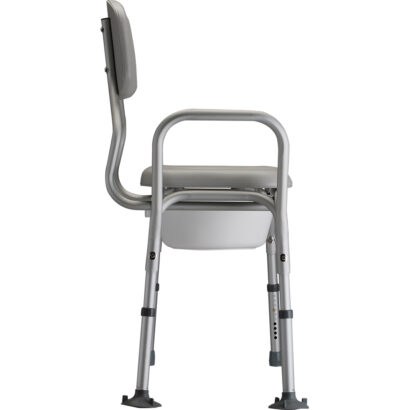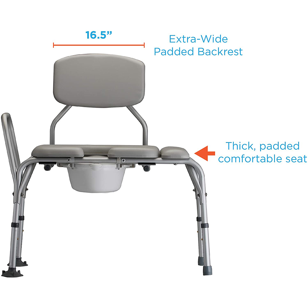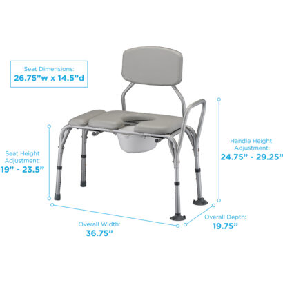 The Padded Transfer Bench with Commode (9073) is designed with an extended seat to allow for seated user transfer and bathing. The commode seat is removable for easy cleaning. The back is push button removable and converts easily for left or right sides. The skid resistant rubber tips on the inside legs have an extra-wide suction base for added safety and security. The bucket can be removed and installed without lifting the user or raising the seat. The bucket and lid are included.Â