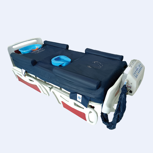 ObboMed Low Air Loss Mattress – Size 80″L x 36″W x 10″ to 14″H — Includes 10″ High Side Bolster — *Includes Patented Bedpan and Shampoo that fit on top of mattress — 4″ H Patented Guardrail — 2-Layer Air Cell and Pump: 50 Liters Per Minute — Low Air Loss: 23 LPM –15 Degree Self Lateral Rotation Wave — Ensures upto 24 hours of protection of bottoming out during power loss.