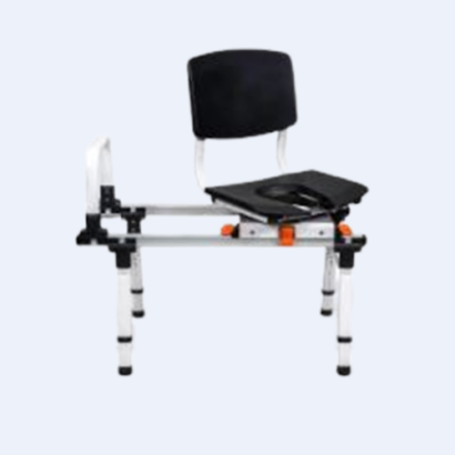 ShowerGlyde Model SG3 is a sliding transfer bench designed to fit in tighter environments or bathrooms with a vanity adjacent to the tub. Shorter rails and a swivel option allow the chair to clear the obstruction/tight space without sacrificing comfort or ease of use.